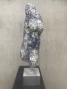 2022Dame van gips, bekleed met Delfs Blauw, geplaatst op aluminium sokkel. Geschikt voor in huis, bijzonder object.